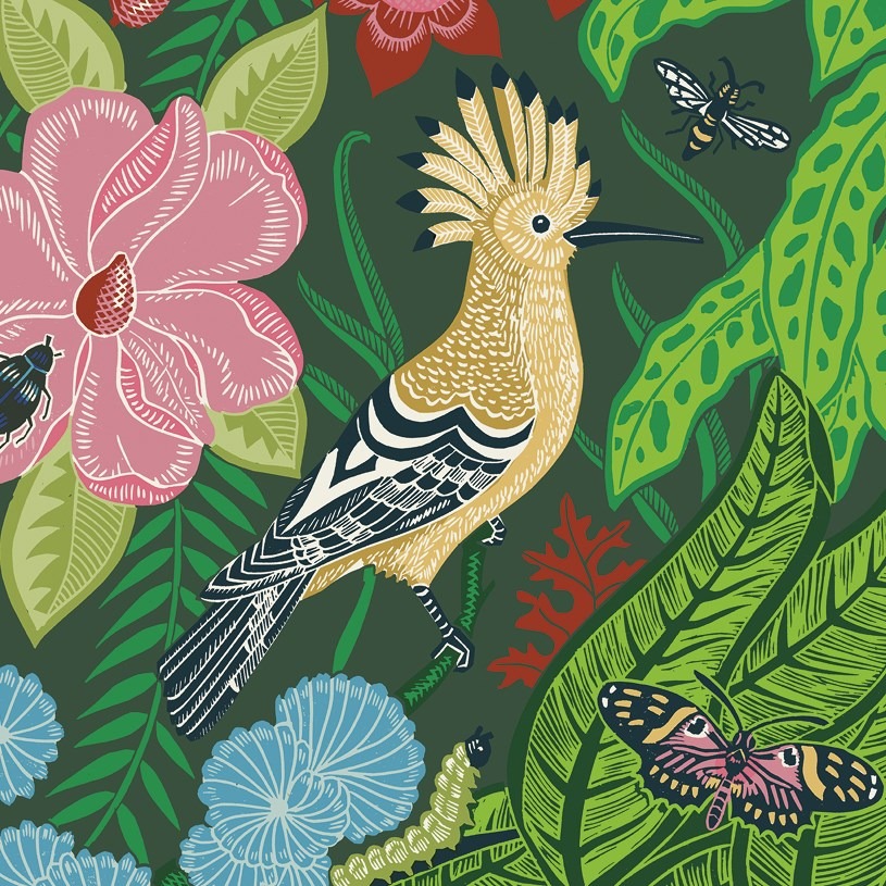 Designed by the highly skilled print maker and textile designer Kate Heiss, the Hoopoe and Bee greetings card is inspired by the beautiful north Norfolk countryside. This card features a wonderfully regal Hoopoe sporting his distinctive crown and delicately curved beak, against a background of flowers and foliage, accompanied by a bee, a beetle, a moth and a caterpillar – what a bargain!